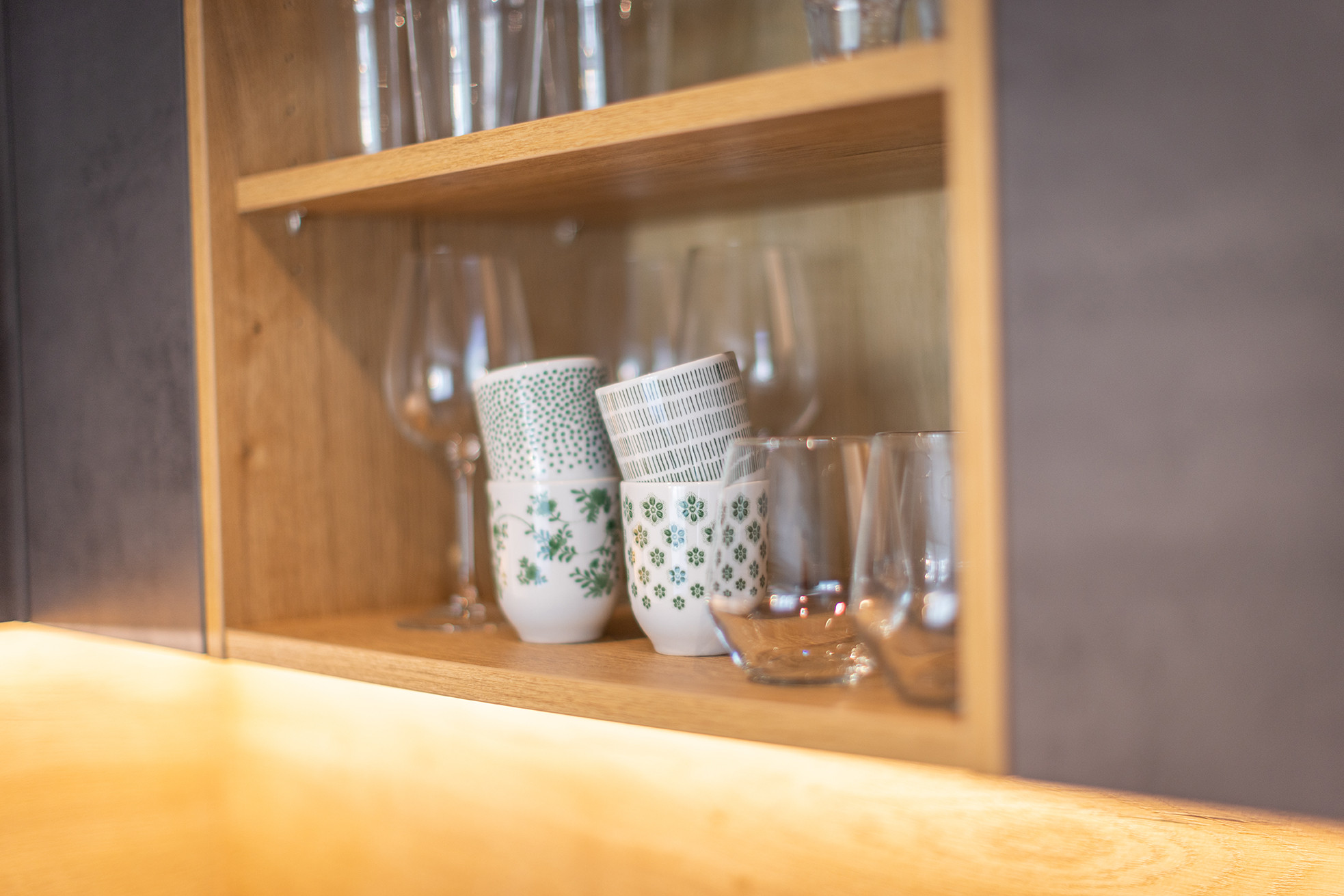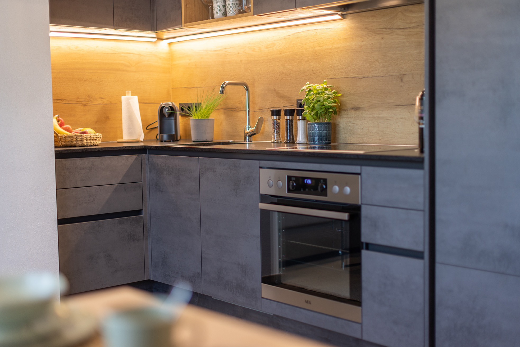 The open-plan kitchen is fully equipped with a stove, oven, fridge with freezer, coffee machine and kettle – ideal for preparing everything from a quick breakfast to a relaxed dinner.