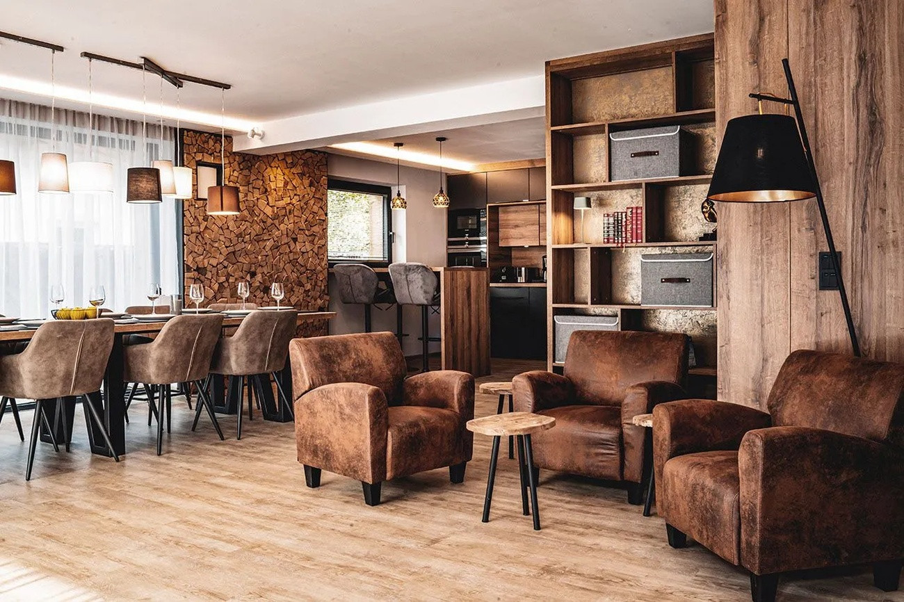 Das Herzstück des Chalets bildet der Wohnbereich, der zu entspannten Zusammenkünften und gemeinsamen Momenten einlädt. Große Fenster durchfluten die Räume mit Tageslicht und öffnen sich zur Terrasse und zum privaten Garten – perfekt, um die frische Bergluft in ruhiger Umgebung zu genießen.