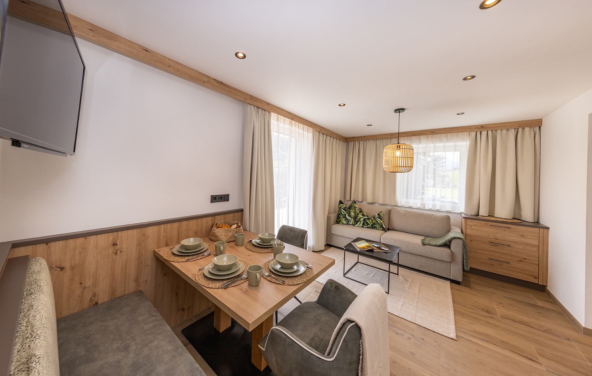 Der helle Wohn- und Essbereich lädt zum Entspannen ein und verfügt über ein Schlafsofa für bis zu zwei weitere Gäste. Ihr privater Balkon mit Esstisch bietet den perfekten Platz, um die frische Bergluft und die ruhige Umgebung zu genießen.