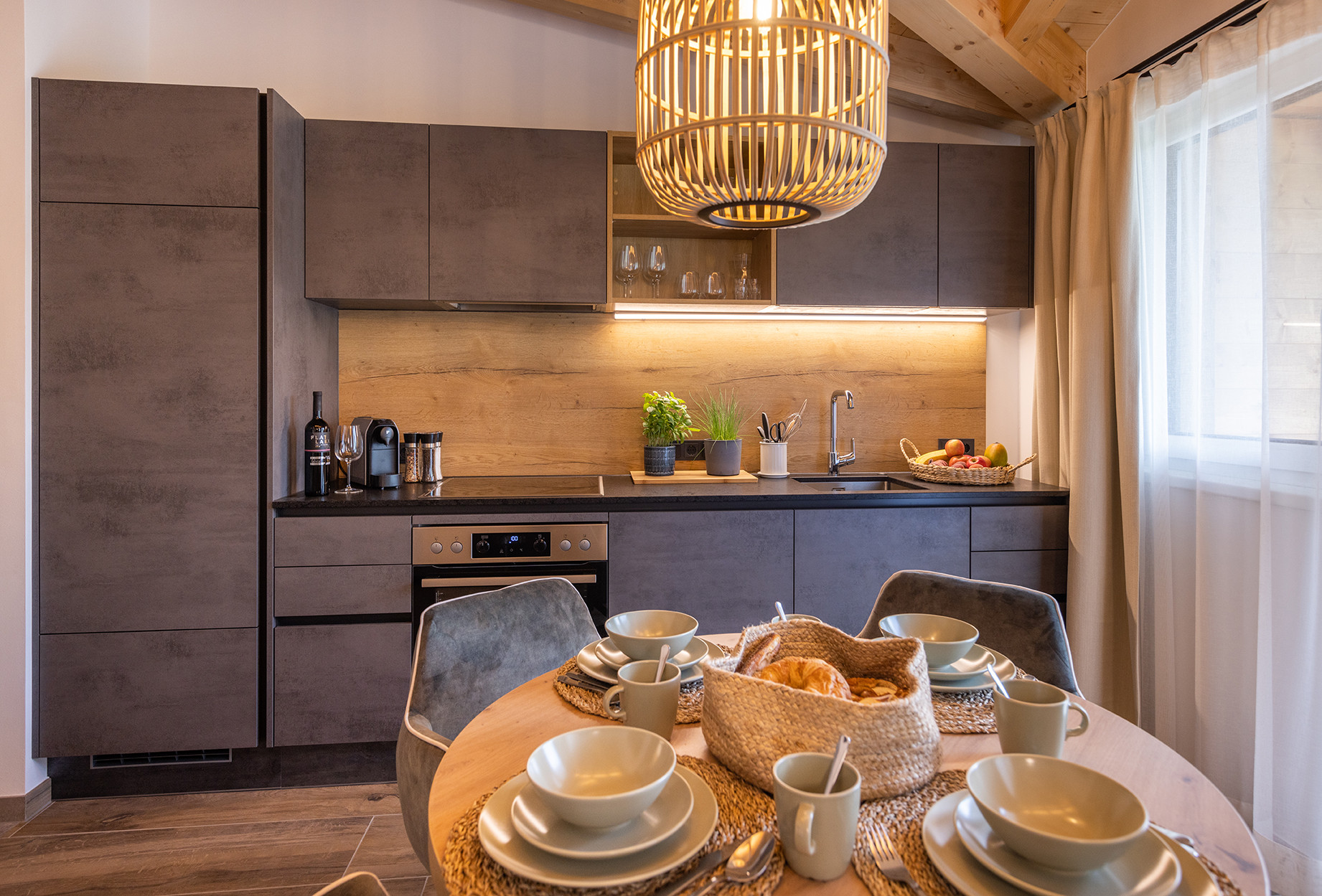 Die offene Küche ist vollständig ausgestattet mit Herd, Backofen, Kühlschrank mit Gefrierfach, Kaffeemaschine und Wasserkocher – ideal für ein schnelles Frühstück oder ein entspanntes Abendessen.
